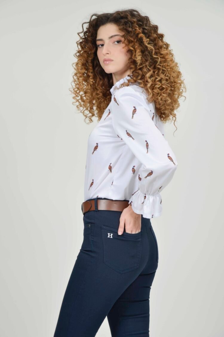 The NEW MALU Side Pheasants is crafted from a soft cotton-lycra blend, offering comfort, stretch, and a flattering fit. Featuring a delicate side-positioned pheasant print, it brings a subtle country heritage touch to a clean, feminine silhouette. Designed with a softly ruffled neckline and gentle volume through the sleeves, our NEW MALU is an elegant yet easy piece for everyday dressing.
